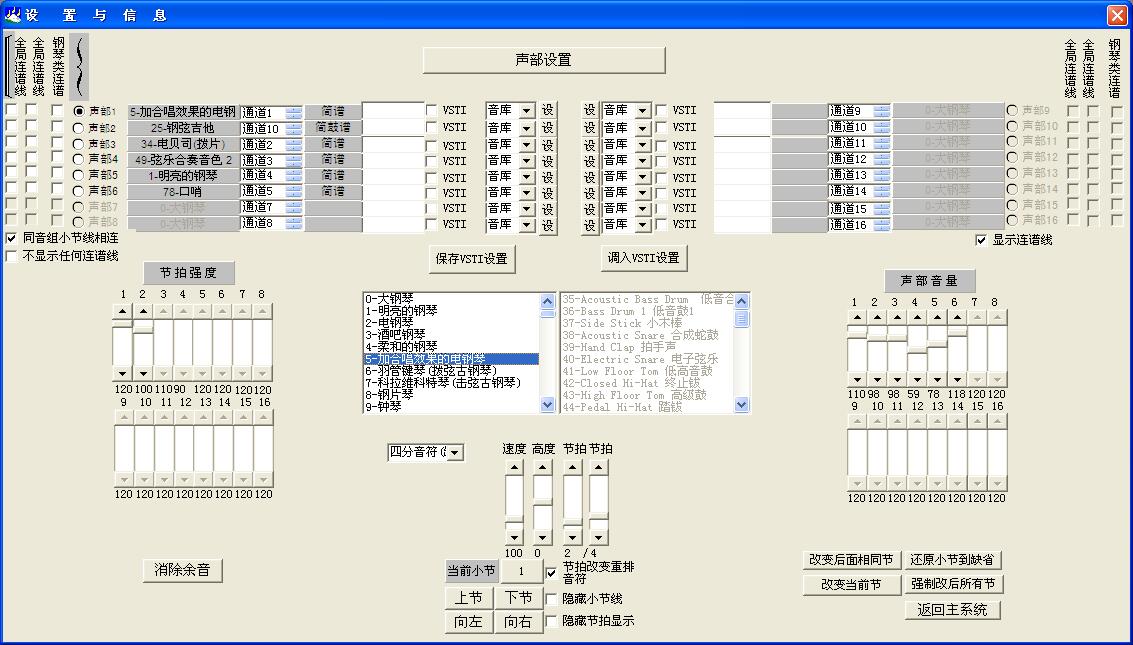 設置各種音色、節拍、速度、連譜線、節拍強度等: