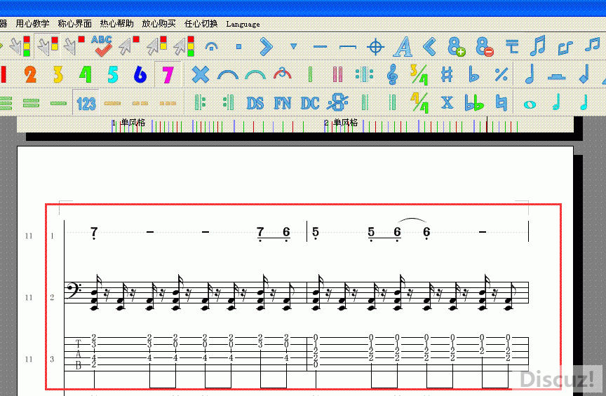 1. 我們首先設置3個聲部的曲譜混排 簡譜 五線譜 吉他譜 如圖: