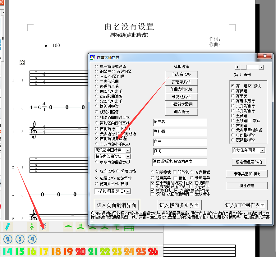 拍弦的輸入在傳統吉他譜軟件中是一個老大難問題,往往需要造字才能解決,而且極其費工費時,音樂夢想家徹底解決了此問題,如下圖,先開啟一個吉他簡譜。