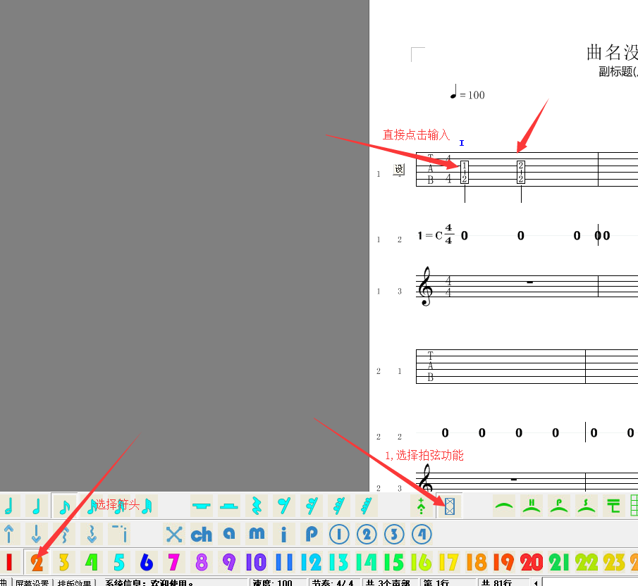 2,如圖,選擇拍弦功能,按下符頭,點擊后即可產生拍弦,可以利用小鍵盤123456快速輸入到各弦上,左邊的1234567890-=對應選擇相應的符頭。