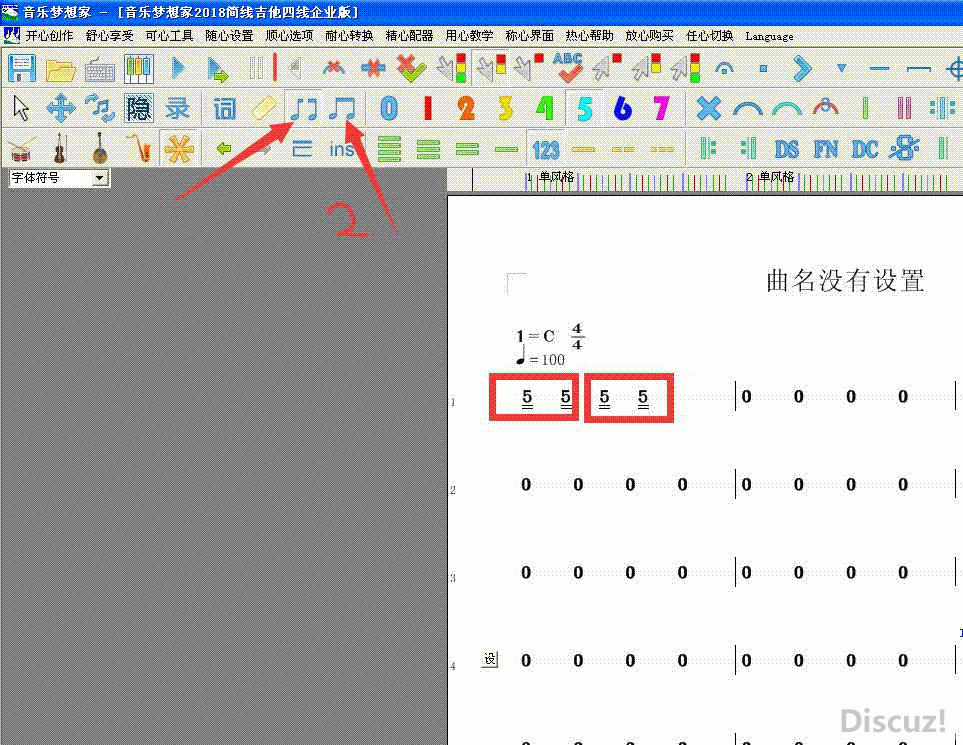 2.點(diǎn)擊圖中箭頭1指向的符號 輸入后的音符都是分開的 然后點(diǎn)擊第2個(gè)箭頭指向的符號 把鼠標(biāo)移動到音符上 顯示十字的時(shí)候 前面音符點(diǎn)一下 后面音符點(diǎn)一下 就可以連起來